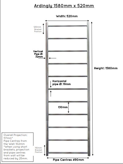 Crafted from 100% stainless steel, and finished by hand, the Ardingly, part of the Sussex towel rail range, is designed to last a lifetime. All of these rails can replace the existing radiator in the bathroom and provide a stunning modern look with plenty of space to dry and warm towels. Each rail is manufactured with standard 1/2” BSP tappings and is pressure tested to 12 Bar. These rails are suitable for all plumbing systems including open systems. BTU/Watt figures are based on T=60K.