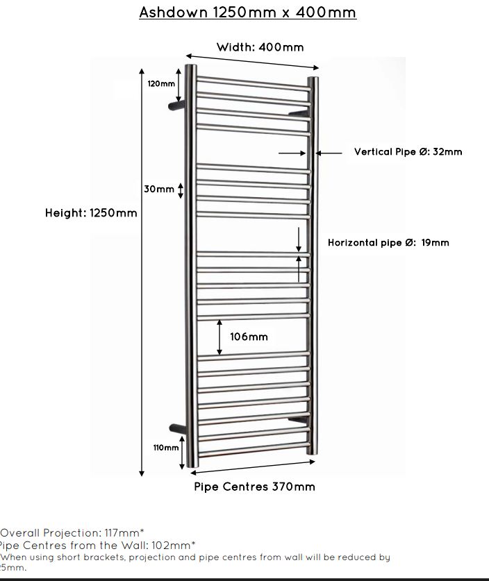 Crafted from 100% stainless steel, and finished by hand, the Ashdown, part of the Sussex towel rail range, is designed to last a lifetime. All of these rails can replace the existing radiator in the bathroom and provide a stunning modern look with plenty of space to dry and warm towels. Each rail is manufactured with standard 1/2” BSP tappings and is pressure tested to 12 Bar. These rails are suitable for all plumbing systems including open systems. BTU/Watt figures are based on T=60K.