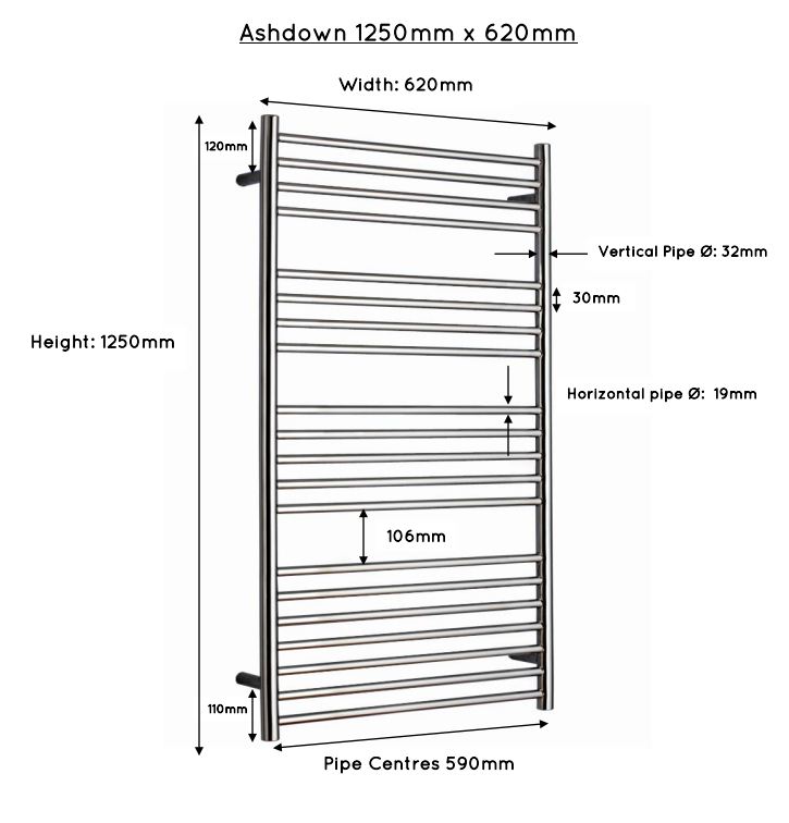 Crafted from 100% stainless steel, and finished by hand, the Ashdown, part of the Sussex towel rail range, is designed to last a lifetime. All of these rails can replace the existing radiator in the bathroom and provide a stunning modern look with plenty of space to dry and warm towels. Each rail is manufactured with standard 1/2” BSP tappings and is pressure tested to 12 Bar. These rails are suitable for all plumbing systems including open systems. BTU/Watt figures are based on T=60K.