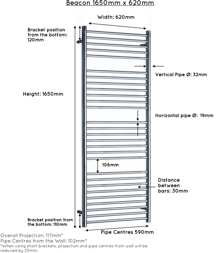 Crafted from 100% stainless steel, and finished by hand, the Beacon, part of the Sussex towel rail range, is designed to last a lifetime. All of these rails can replace the existing radiator in the bathroom and provide a stunning modern look with plenty of space to dry and warm towels. Each rail is manufactured with standard 1/2” BSP tappings and is pressure tested to 12 Bar. These rails are suitable for all plumbing systems including open systems. BTU/Watt figures are based on T=60K.