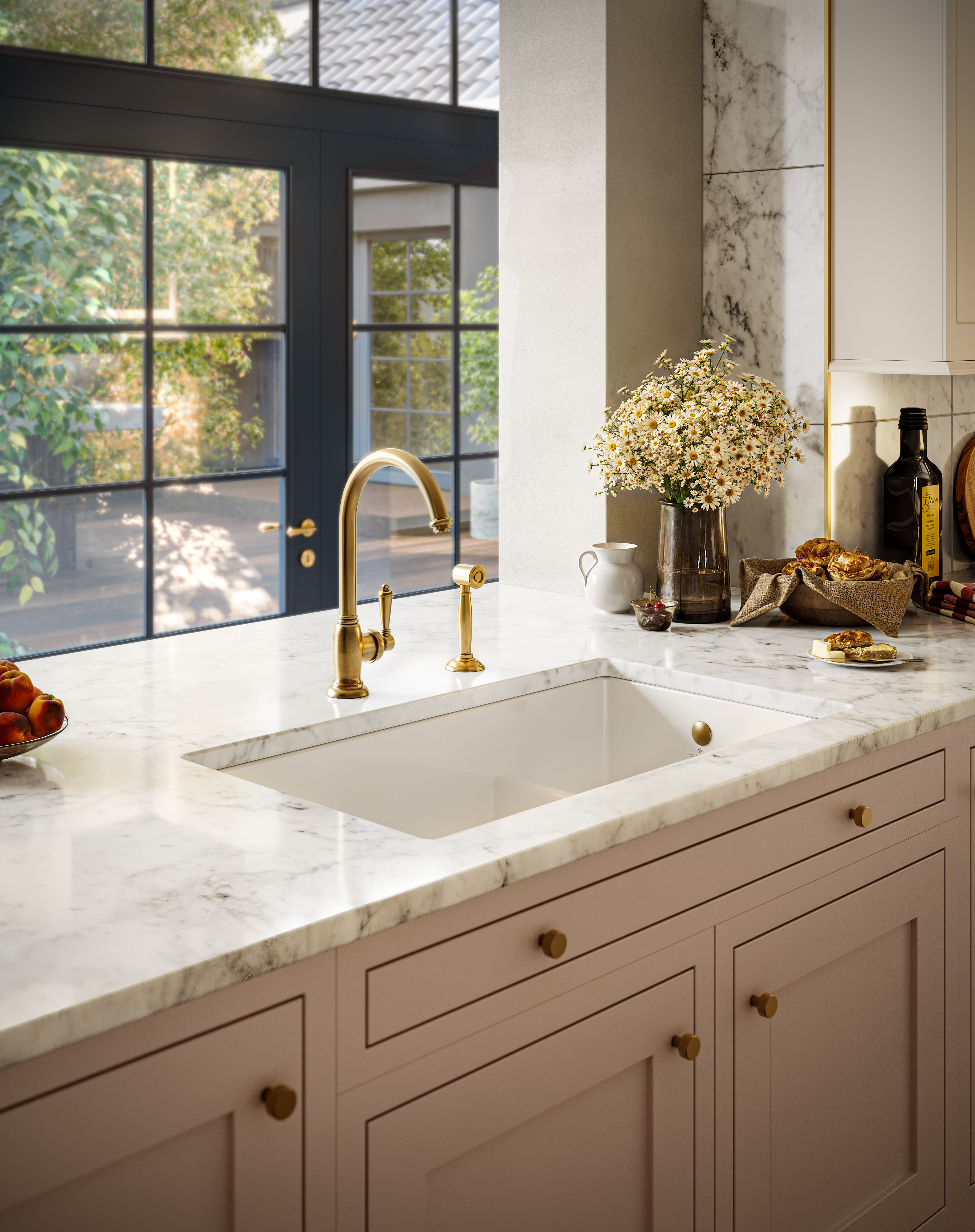 - With two central 3.5" waste outlets, suitable for either a basket strainer waste or waste disposal unit