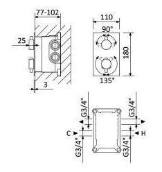 The Linea by Tap Shop Thermo Valve 3 Outlet A concealed thermostatic valve body capable of serving three independent outlets (e.g., overhead shower, handset, body jets) via three control handles/diverters. Thermostatic temperature regulation to maintain a safe, set water temperature despite pressure fluctuations (prevents scalding or cold shocks). Diverter/flow controls: typically the top and bottom handles select outlet combinations, and the middle handle adjusts temperature. Minimum operating pressure 1bar. Durable construction brass body with ceramic disc cartridges for longevity, and anti‑limescale/anti‑calc features built in. 3/4"inlet and outlet connections deliver a high water flow rate.
